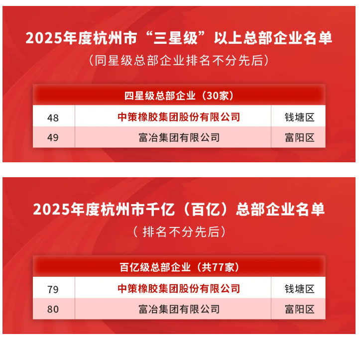 【炭黑产业网】2月2日消息,近日,杭州市2025年度星级总部企业评定结果尘埃落定。中策橡胶凭借自身强大的综合实力以及稳定且良好的发展态势,再度斩获“杭州市四星级总部企业”称号,同时还荣获“杭州市百亿级总部企业”殊荣。这一成果不仅进一步夯实了公司在区域经济发展中的关键支撑地位,更是对其在规模贡献、创新能力以及成长潜力等多方面的高度肯定。